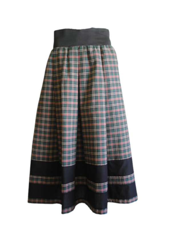 56,00€Falda evocación Galicia. Lleva bolsillos ocultos entre los pliegues. Una prenda con aires gallegos y corte contemporáneo. Debido a su cinturilla elástica se adapta a varias tallas color predominante el verde