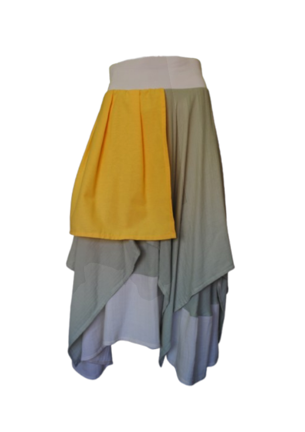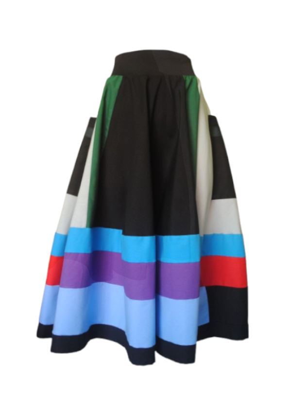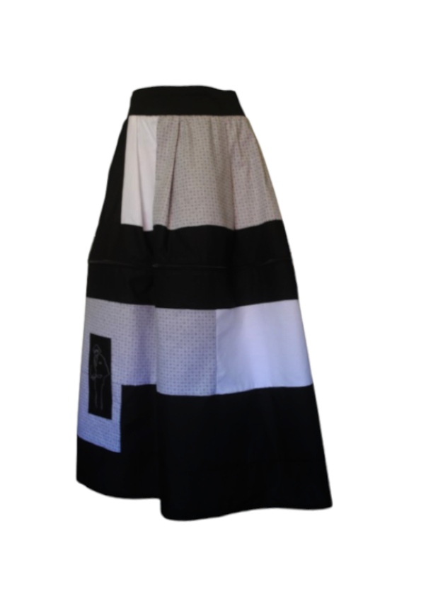 75,00€Falda con muchísimo vuelo y bolsillos superpuestos con detalle . Evocación Galicia Es una pieza con mucho movimiento y con tejidos combinados. Se adapta a varias tallas debido a su diseño y cinturilla elástica. Tallaje a partir de una M PIEZA ÚNICA