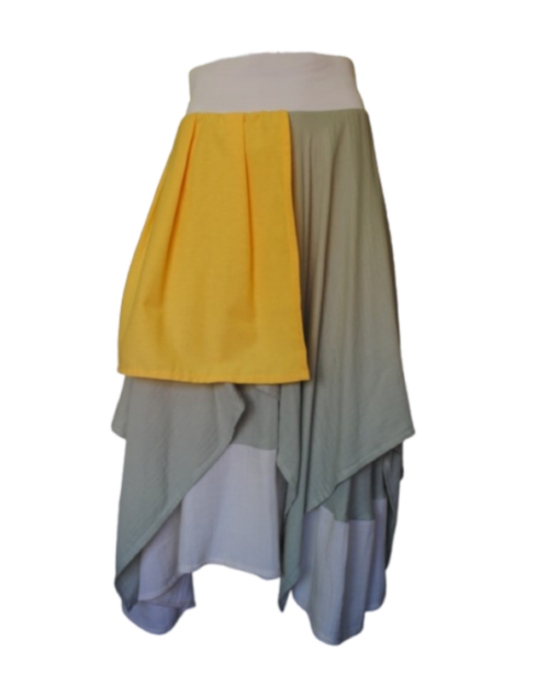60,00€Falda de tres capas con juego de tejidos y texturas. Tejido obtenido en comercio de proximidad. Lleva unas tiras para poder acortar la capa superior