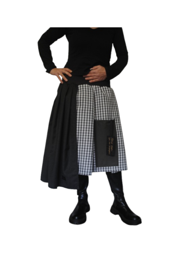 Falda dúo con bolsillo que lleva una frase de bordado manual.