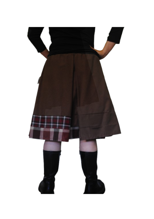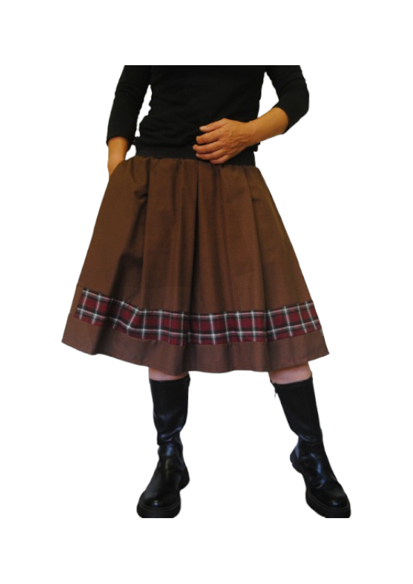 Falda con corte líneal  y  bolsillos en sus laterales escondidos tras sus pliegues . La trasera tiene dos pliegues encarados que favorecen a la silueta del cuerpo . Por las características de su cintura y corte se adaptan a varias tallas