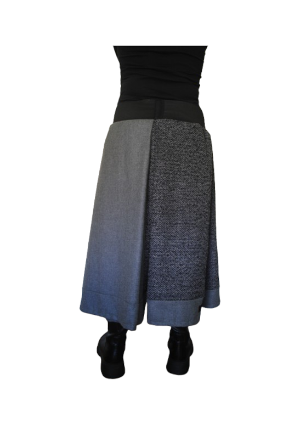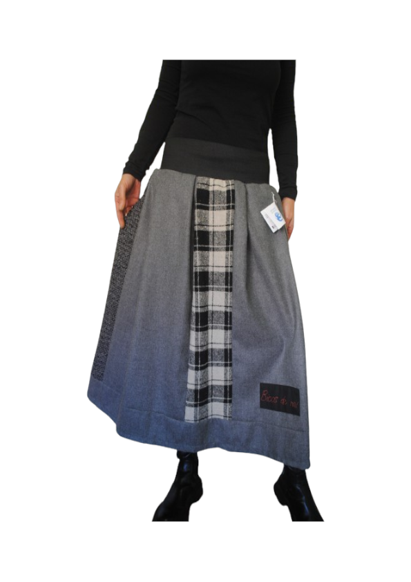 Falda con corte líneal y distintas texturas de tejido cálido . Pequeño bordado manual . Por las características de su cintura y corte se adaptan a varias tallas