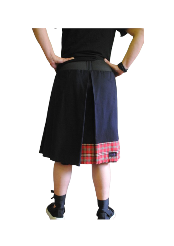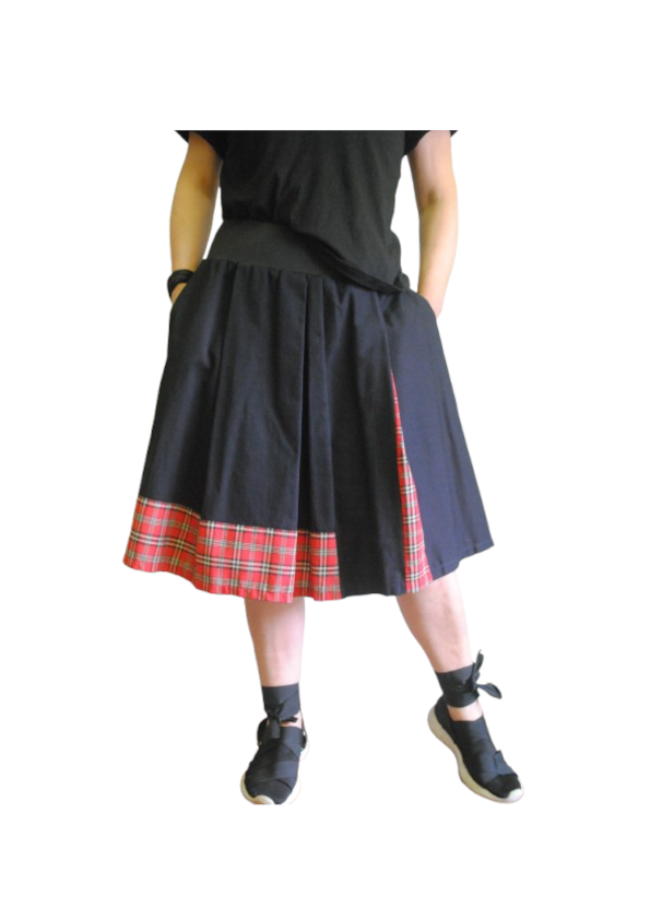 Falda con corte líneal  y  bolsillos en sus laterales escondidos tras sus pliegues . La trasera tiene dos pliegues encarados que favorecen a la silueta del cuerpo . Por las características de su cintura y corte se adaptan a varias tallas