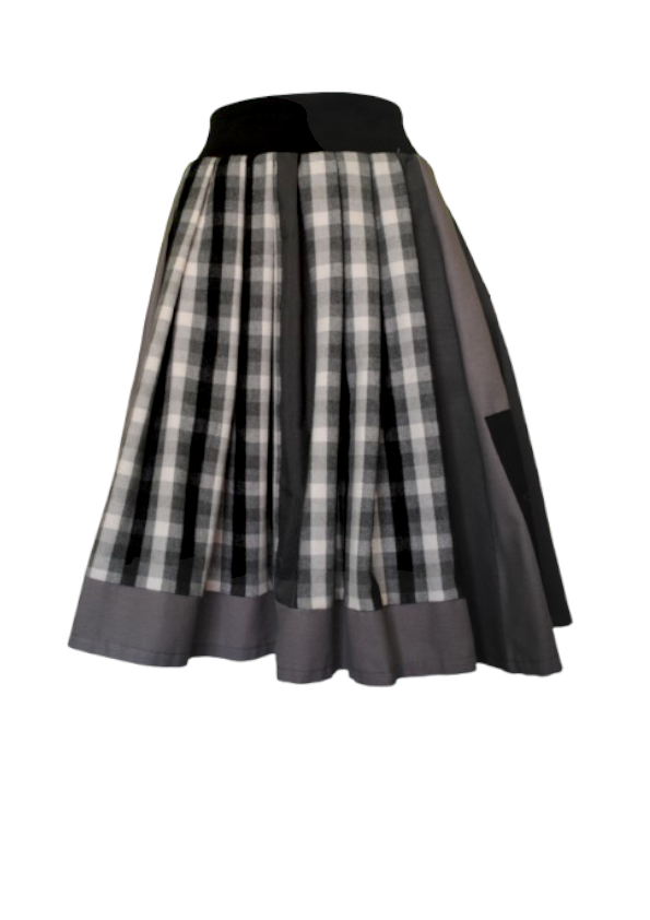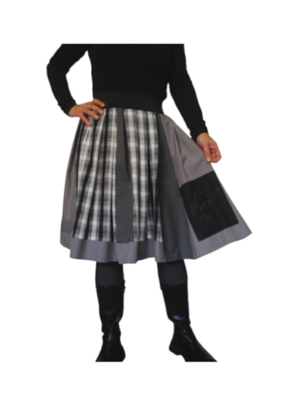 Falda con diferentes texturas de tejido, incluyendo una franela de cuadros,…lleva un bordado manual de Castelao. Es una pieza de tallaje pequeño, se adapta hasta una talla M máximo