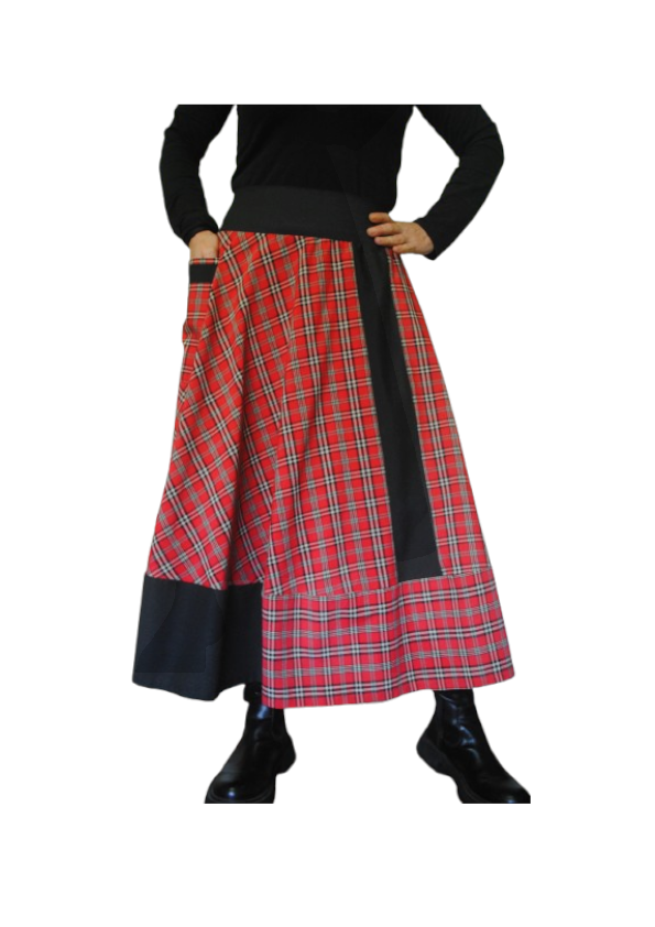 Falda circular con tejido escocés combinado con otras texturas de tejido; bolsillo exterior