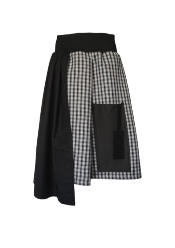 51,00€alda que recuerda a la sensación de llevar saia, con aires galegos y corte contemporáneo. Pieza con distintos tejidos y con estructura. Lleva bolsillos ocultos entre sus pliegues y una ancha cinturilla elástica que se adapta a varias tallas. En este caso tallaje mas bien pequeño, hasta una L